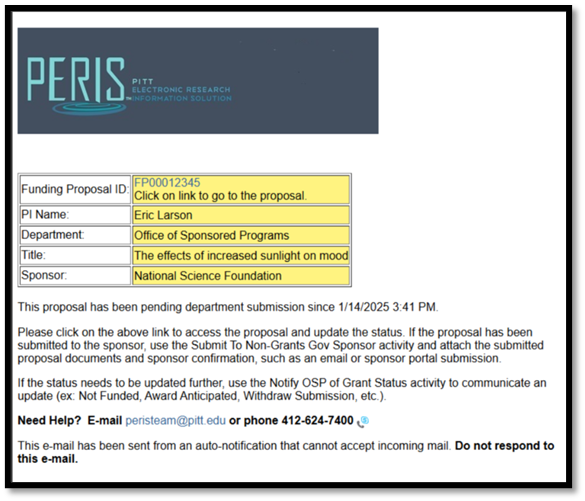 To ensure that MyFunding data remain accurate, any funding proposal that stays in ‘Pending Department Submission’ status will trigger an automated notification every 7 days to both the Department Administrator and the Principal Investigator. At each notification, the funding proposal status should be reviewed and updated when possible.