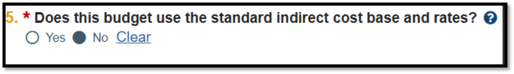 Figure 2. Click ‘No’ to answer Question 5 on Standard Indirect Cost Rates