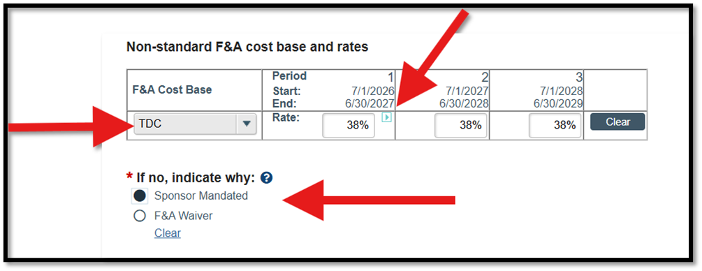 Figure 3. Update the F&A Cost Base to TDC, Enter the Rate and Reason Why